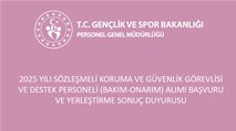 2025 YILI SÖZLEŞMELİ KORUMA VE GÜVENLİK GÖREVLİSİ VE DESTEK PERSONELİ (BAKIM-ONARIM) ALIMI BAŞVURU VE YERLEŞTİRME SONUÇ DUYURUSU