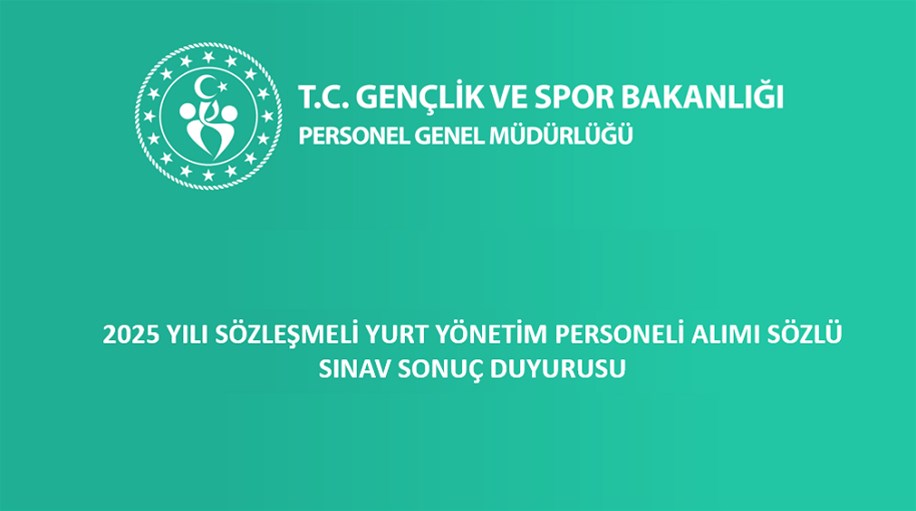 Bakanlığımız taşra teşkilatı yurt müdürlüklerinde istihdam edilmek üzere, 29 Eylül – 03 Ekim 2025 tarihlerinde gerçekleştirilen “2025 Yılı Sözleşmeli Yurt Yönetim Personeli Alımı” sözlü sınavına katılan adaylar sözlü sınav sonuçlarını Cumhurbaşkanlığı kariyer kapısı (https://kariyerkapisi.gov.tr/isealim ) Başvurularım – Değerleme Sonuçları başlığı altından öğrenebilecektir.
